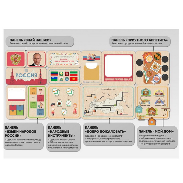 Комплект образовательных стеновых панелей для развития у дошкольников представлений о национальном многообразии Российской Федерации. Содержит 6 тематических блоков: символика России, гербы и флаги регионов, территориальное расположение этносов, народные инструменты, языки, традиционные жилища и блюда народов. Подходит для занятий по программе «Патриотическое воспитание» в детских садах и начальной школе.