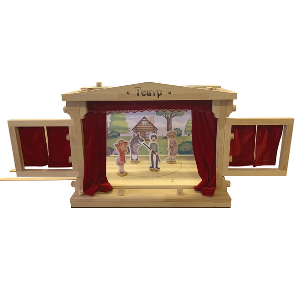 Миниатюрный кукольный театр помогает развить коммуникативные и творческие способности. Сцена вращается, занавес открывается и закрывается механически. Руки актеров скрываются за подвижными ширмами. Предусмотрено 2 вида подсветки: верхняя и фронтальная. Включение, выключение и уровень яркости настраиваются поворотом круглого элемента в переднем левом углу конструкции.