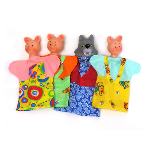 Непосредственно перчатки, выполняющие роль одежды героев, у всех разной расцветки. Кукольный театр "Три поросенка" упакован в полиэтиленовый пакет с картонной полосой. В комплекте: 3 поросенка, волк, сценарий.